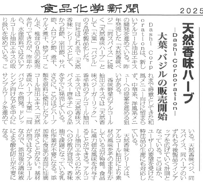 2025年9月25日号の食品化学新聞8面に、「天然香味ハーブ」として「大葉」「バジル」販売開始の記事が掲載されました。