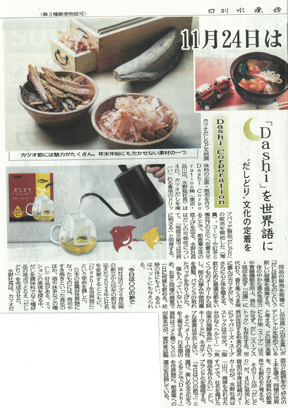 2025年11月21日号の日刊水産経済新聞2面に、当社の紹介と飲む出汁「だしどり」の記事が掲載されました。